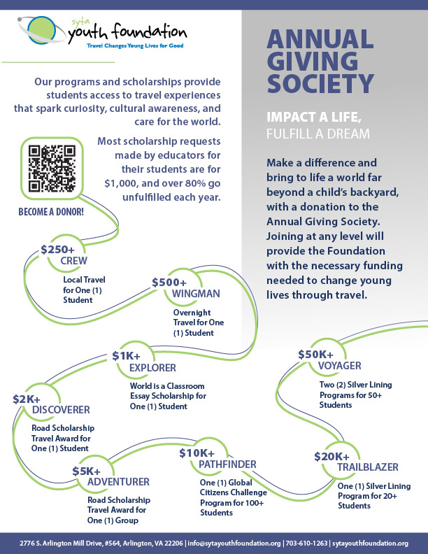 Loading... Folder SYTA Youth Foundation Infographics SYTA Youth Foundation Infographics » SYTA Youth Foundation Infographics » Annual Giving Society Image Annual Giving Society Download (pdf) SYTA Youth Foundation Infographics » SYTA Youth Foundation Infographics » Our Impact Infographic Image Our Impact Infographic Download (jpg) SYTA Youth Foundation Infographics » SYTA Youth Foundation Infographics » Social Impact of Student Travel Image Social Impact of Student Travel Download (jpg) Travel has a profound effect socially on young people. This graphic can be used to demonstrate that.